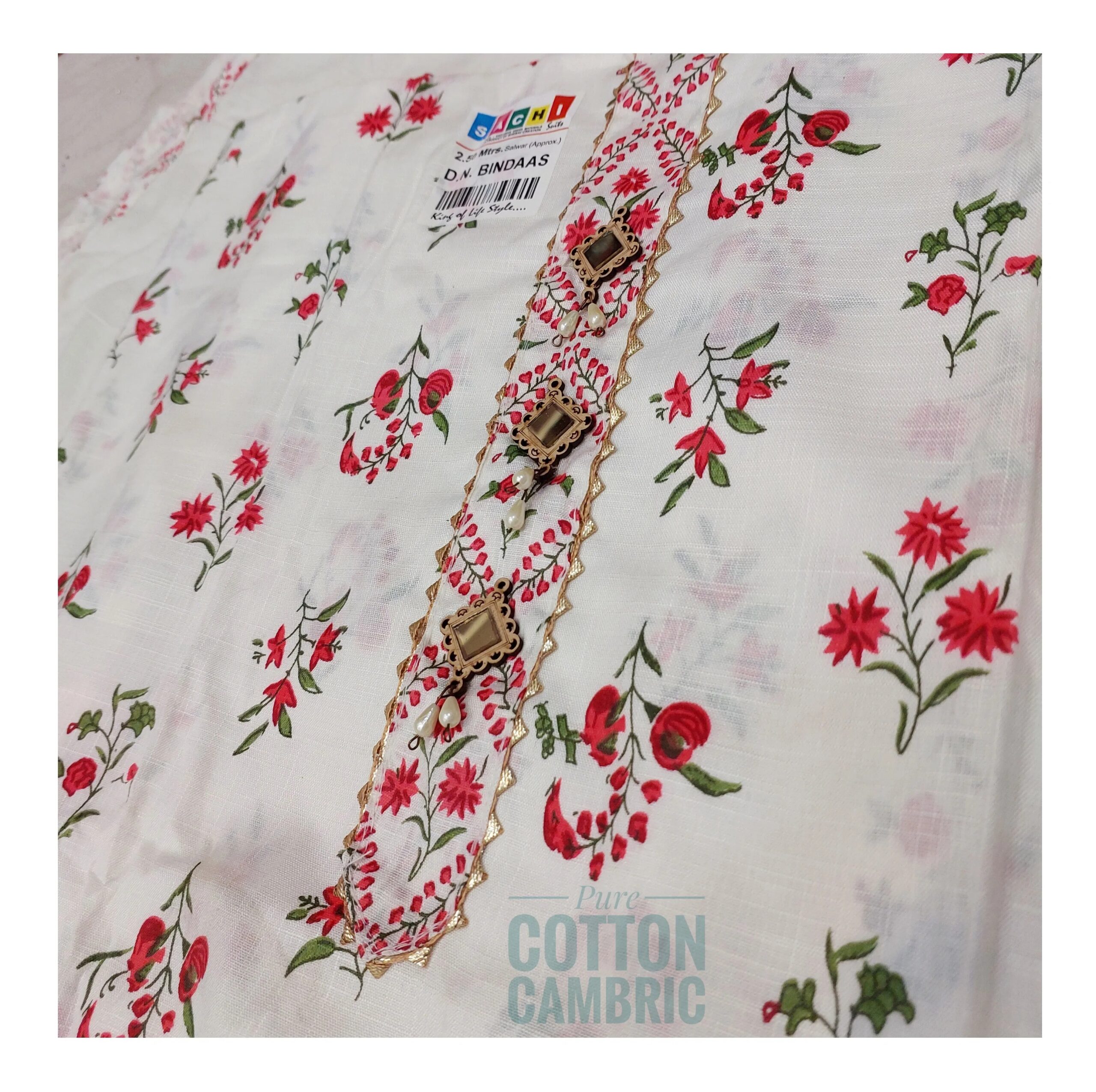 Crafted from premium Pure Cotton Cambric, this set is a complete package of comfort and charm. The floral-printed kurti fabric is enhanced with a lace-bordered neckline, designer buttons, and delicate detailing. The set is paired with a coordinated printed cotton bottom and matching dupatta featuring subtle tassel work – perfect for summer days and casual festive moments.